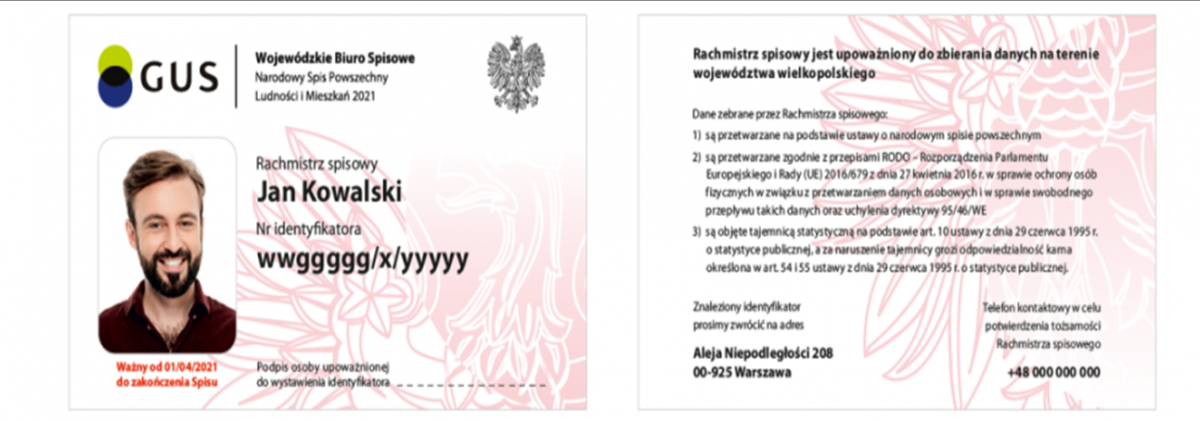 Każdy rachmistrz spisowy posiada odpowiedni identyfikator – zdjęcie, imię i nazwisko, nr identyfikatora, datę ważności identyfikatora, informację do jakich działań jest upoważniony.